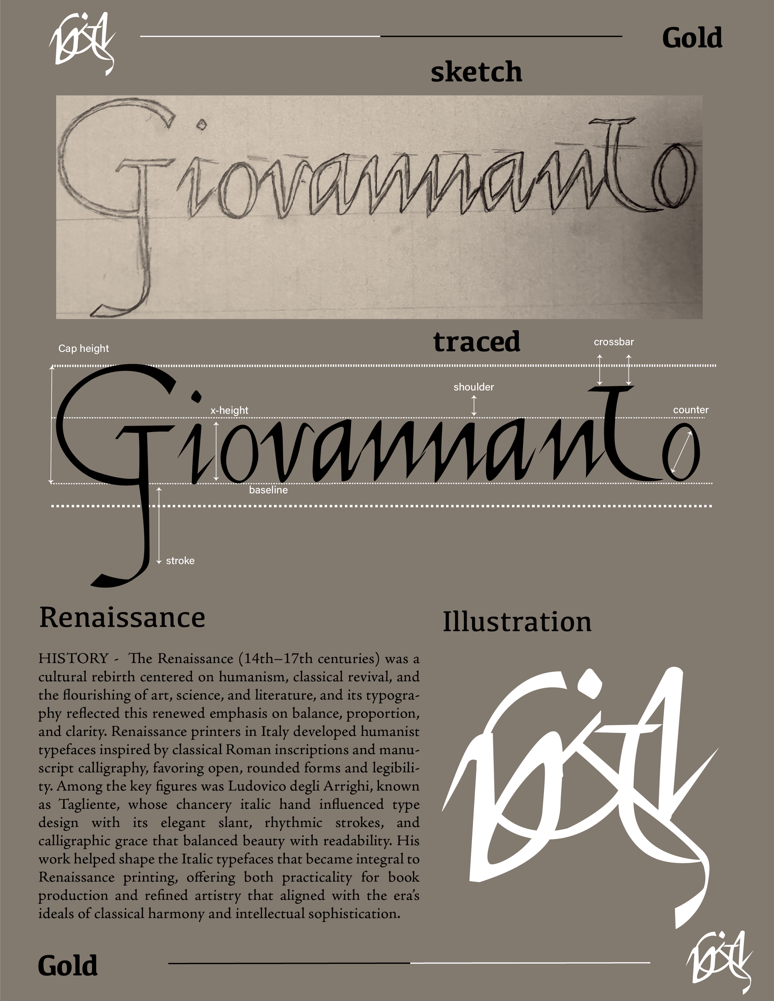 The Renaissance was the cultural rebirth of humanism, classical revival, and the flourishing of art, science and its typography. The types of that time was inspired by the classical Roman inscriptions and manuscripts and calligraphy, hence where the term "italic" was is a slanted, light-bodied typeface used for emphasis, foreign words, and titles, and it originated in 15th-century Venice, Italy. The tools I used is pen tool, shape tool, anchor and direct selection tool.