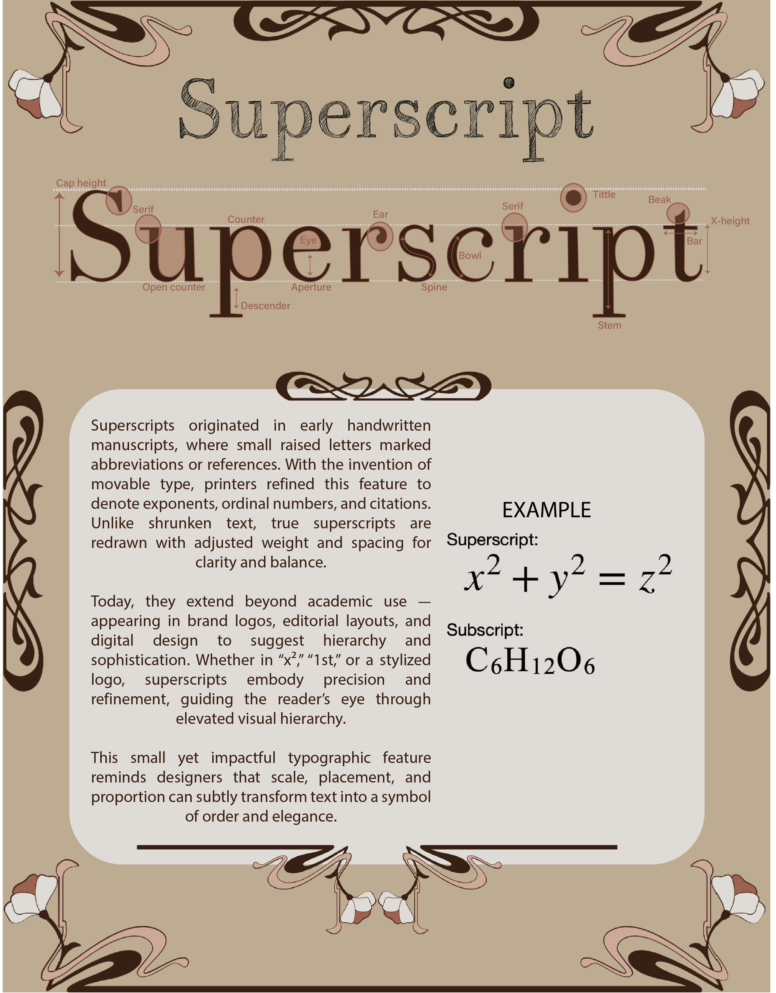 For this project, I researched the history and anatomy of Superscript, tracing its origins from handwritten manuscripts to modern typography. I designed a poster in Illustrator labeling key typeface parts and showing examples like x² + y² = z². The layout combines historical detail with contemporary design, highlighting how superscripts enhance hierarchy, readability, and elegance in text composition. I used the shape tool, line tool, and pen tool to create the typeface to Le Jeune Font and then highlight type anatomy terminology of the term superscript.