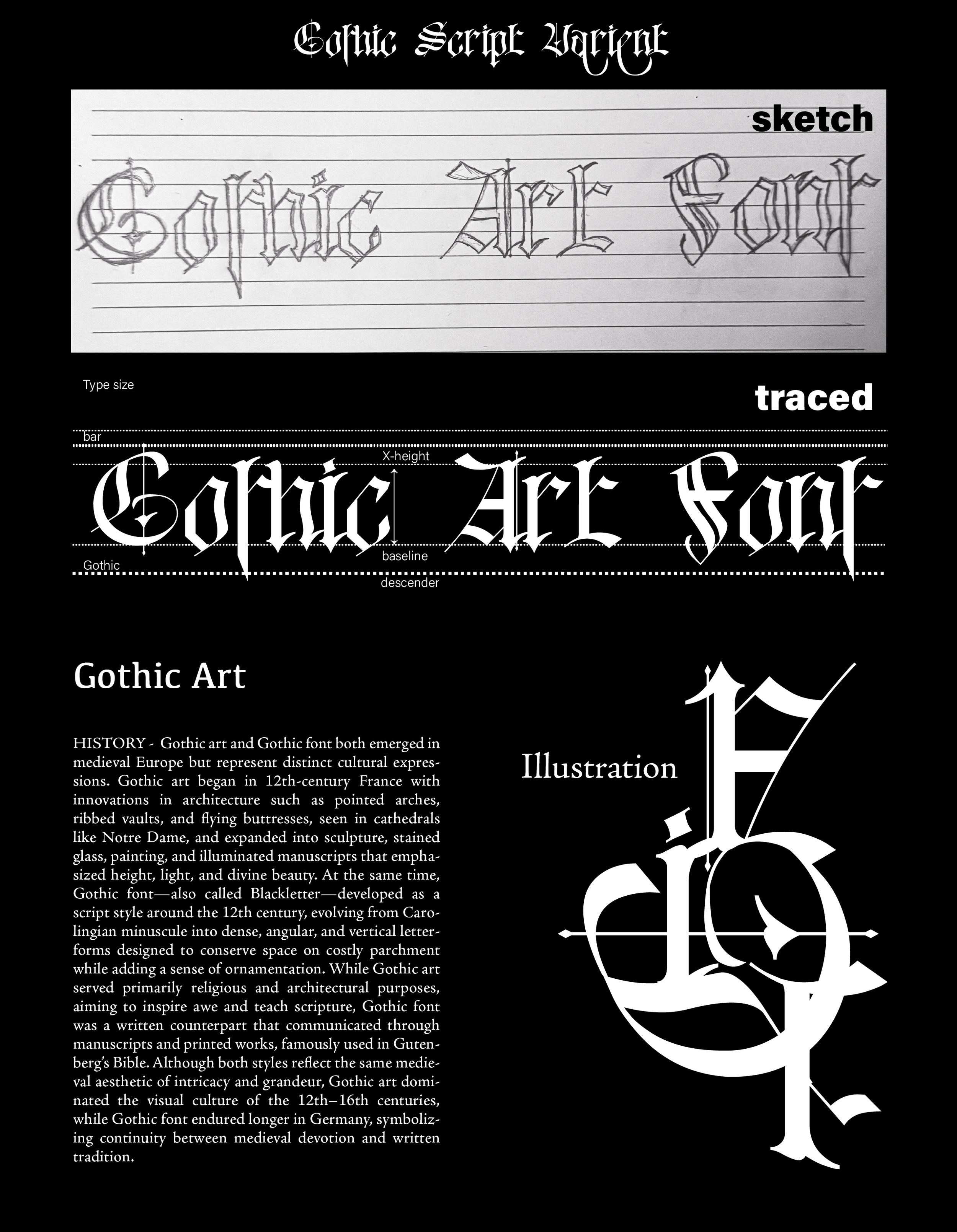 For this assignment, I was learning about the gothic art and its font (also known as the Blackletter) founded in 12th century. Used predominately in churches served as primarily religious and architectural purposes, aiming to inspire awe and teach scripture, Gothic font was a written counterpart that communicated through manuscripts and printed works, famously used in Gutenberg’s Bible. I looked into different styles and picked the style that I was most interested in writing. Sketched in notebook and then translated into illustrator to trace.